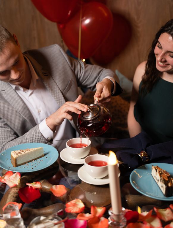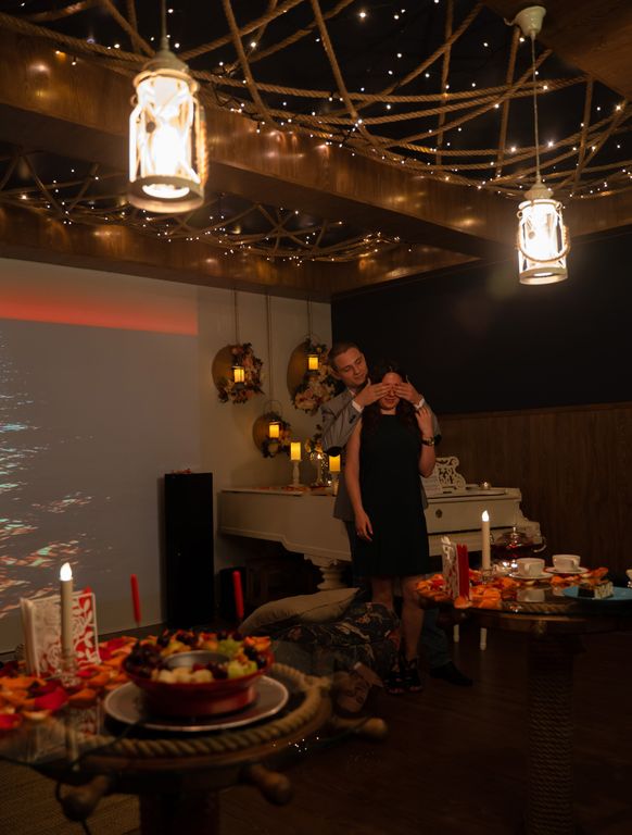● Зал, украшенный свечами и живыми лепестками роз ● Приглушённый свет ● Романтическая музыка ● Удобный и мягкий диван с подушками ● Красивое слайд-шоу из ваших фотографий (подготавливается нами заранее) ● Оформление воздушными шарами (7 шт.)